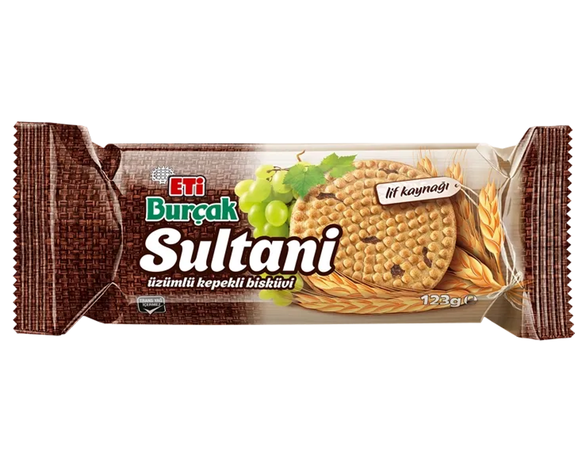 The sultan of the ETi Burçak family: ETi Burçak Sultani! A perfect blend of carefully selected raisins and bran, combined with the delightful ETi Burçak biscuit.