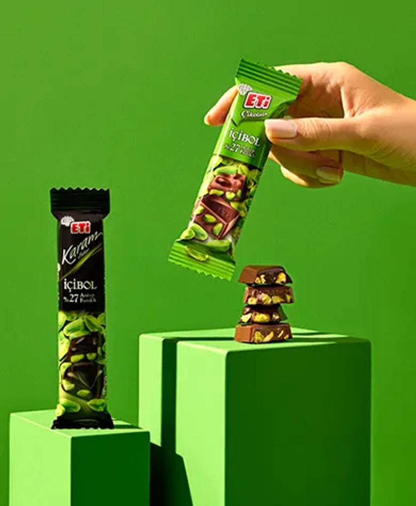 The intense pleasure of bitter chocolate with 27% Antep pistachio content is here: Karam İçbol with Pistachio!