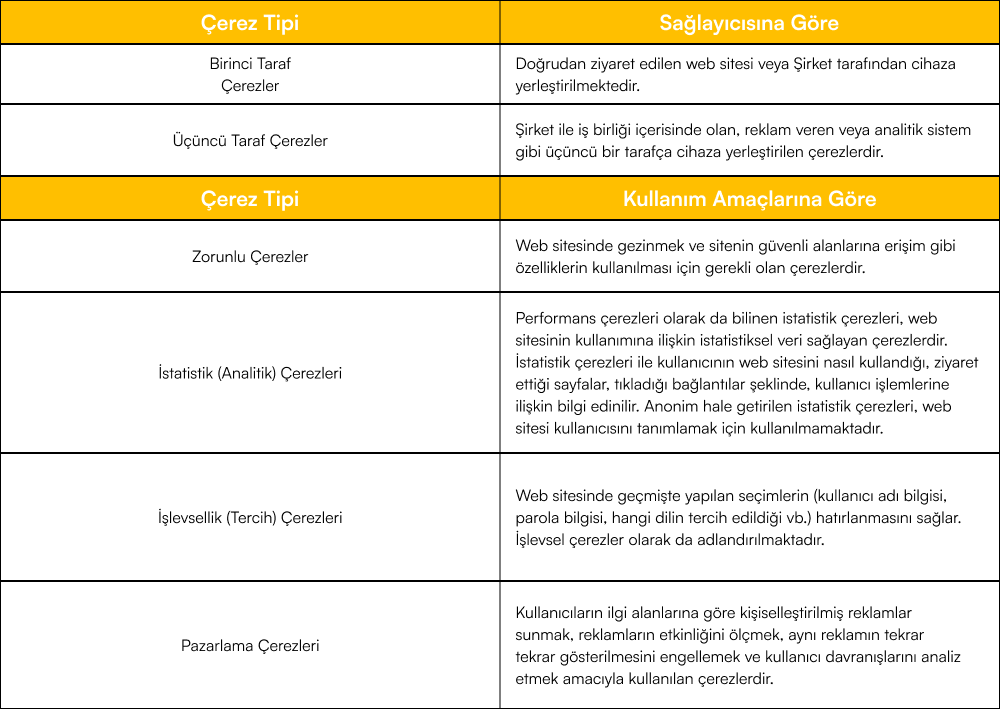 Sitemizde kullanılan çerezler ve çerezlerin hangi amaçlar ve hukuki sebepler kapsamında kullanıldığına dair bilgilere aşağıda yer verilmektedir:
