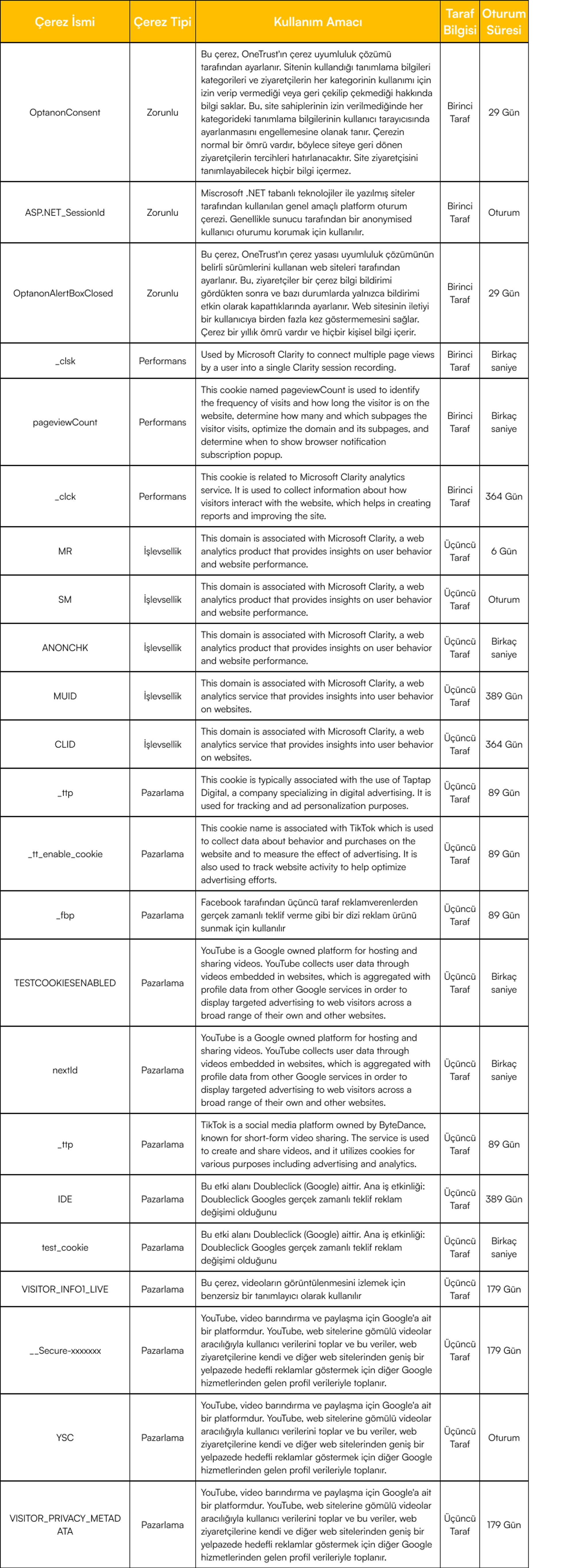 Sitemizde kullandığımız çerezleri ve bu çerezleri hangi amaçla kullandığımıza dair bilgileri aşağıda yer alan listede bulabilirsiniz: