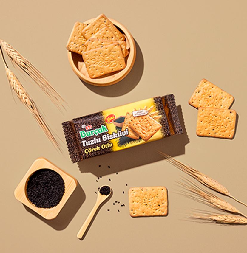 Yılların klasiği Burçak'ın artık tuzlu bisküvileri de var! Vazgeçilmez Burçak bisküvisi çörek otlarıyla buluştu. Doyuruculuğu da lezzeti de Eti Burçak'tan!