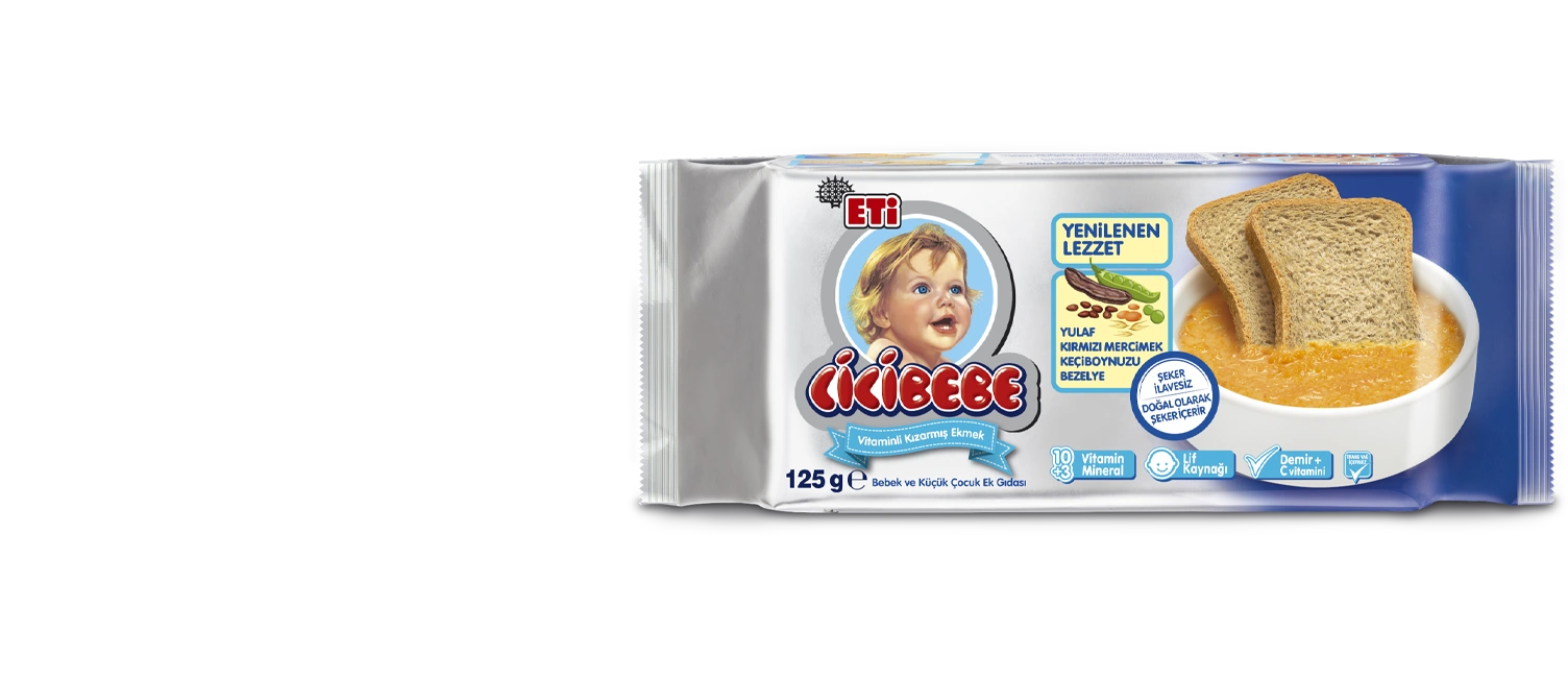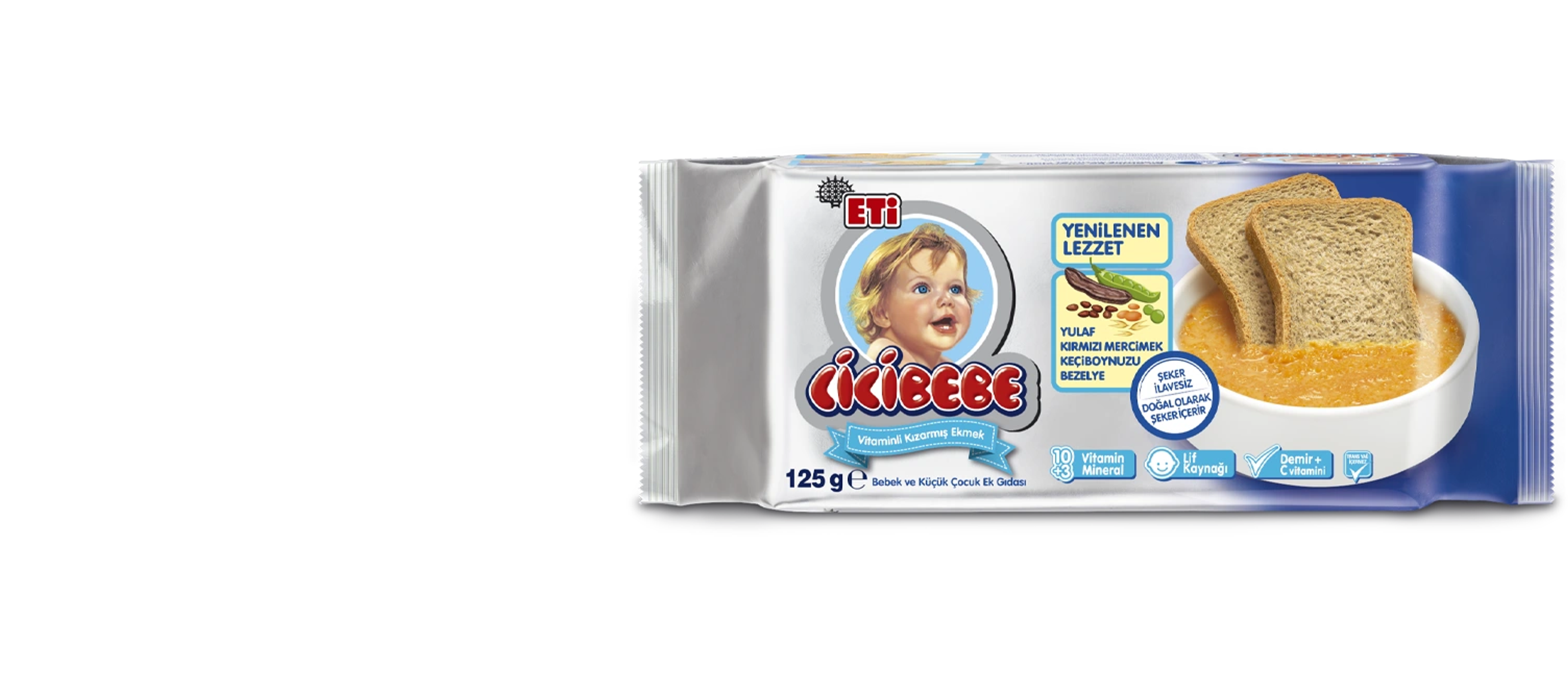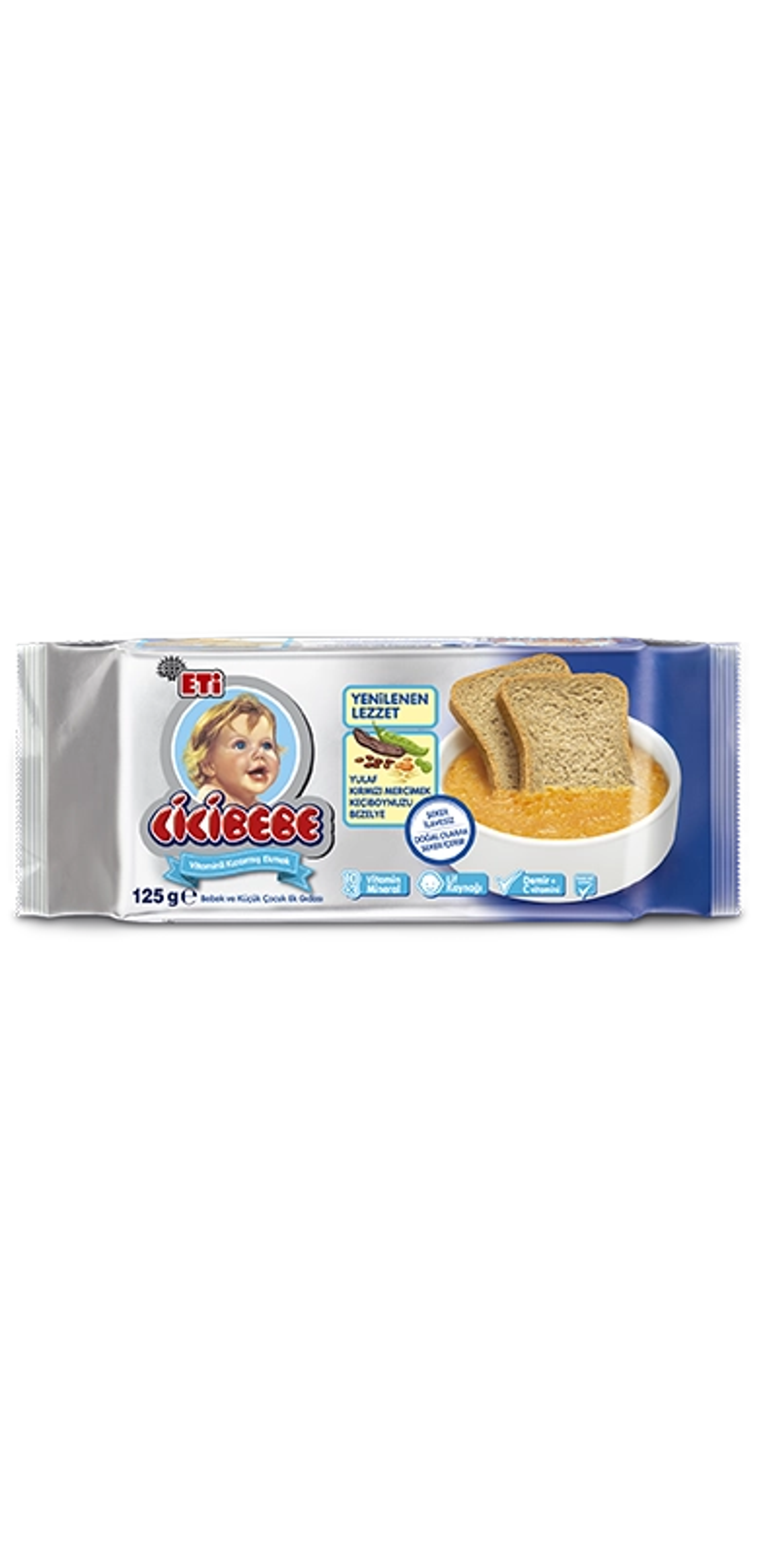 Eti Cicibebe Vitaminli Kızarmış Ekmek, içeriğindeki minerallerin yanı sıra yulaf, keçiboynuzu, kırmızı mercimek ve bezelye de içeriyor. Hem besleyici hem lezzetli bir lif kaynağı olan Eti Cicibebe Vitaminli Kızarmış Ekmek ile bebekleriniz için doyurucu öğünler hazırlarken çiğnemeyi öğrenmelerine de katkıda bulunabilirsiniz.