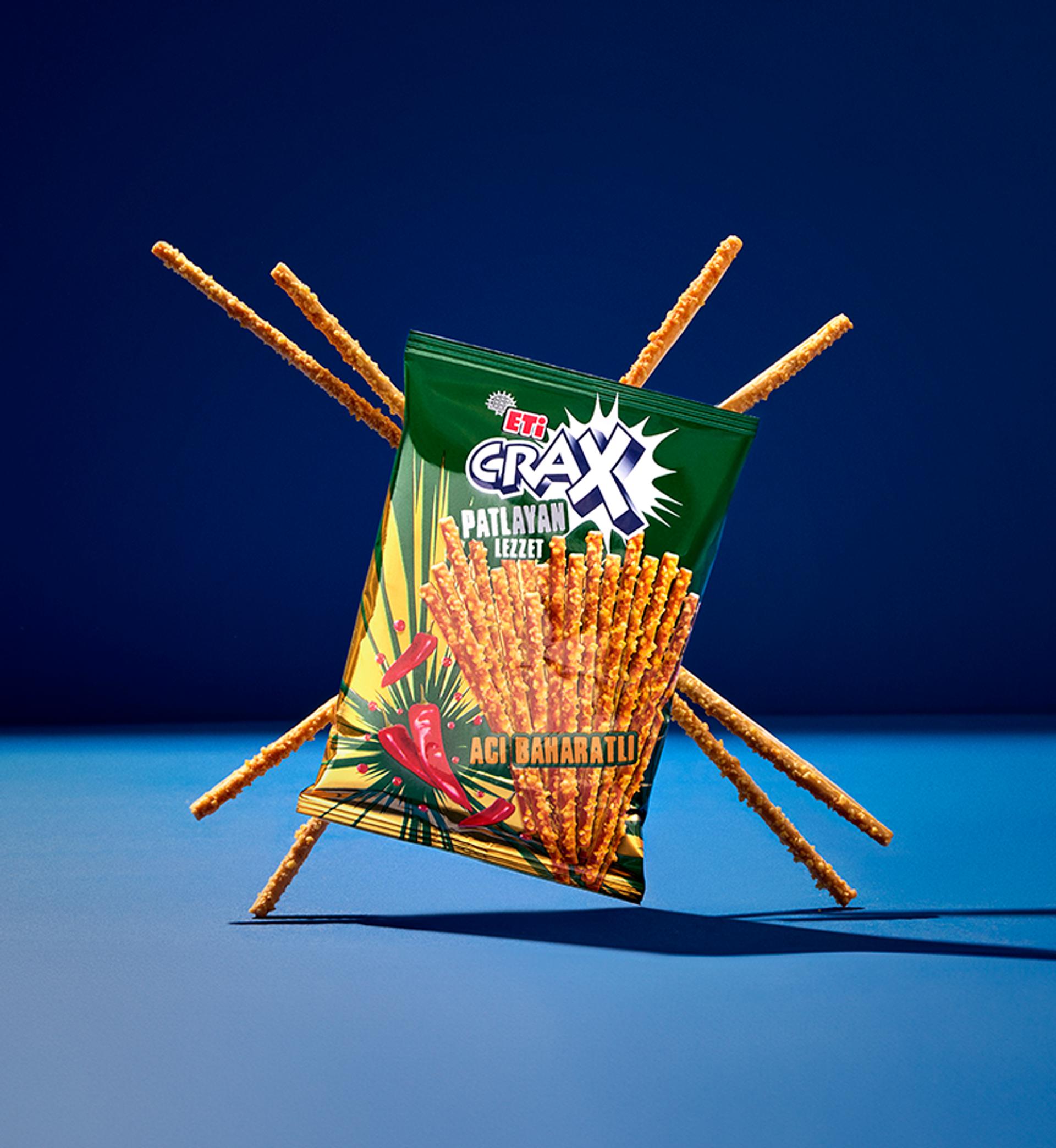 Eğlenceyi de lezzetti de patlatan ETİ Crax Patlayan Lezzet Acı Baharatlı! Üzerinde bulunan çıtır parçacıklar ve yoğun lezzeti sayesinde atıştırmak çok daha keyifli. Hadi durma, eğlenceyi Crax'la!