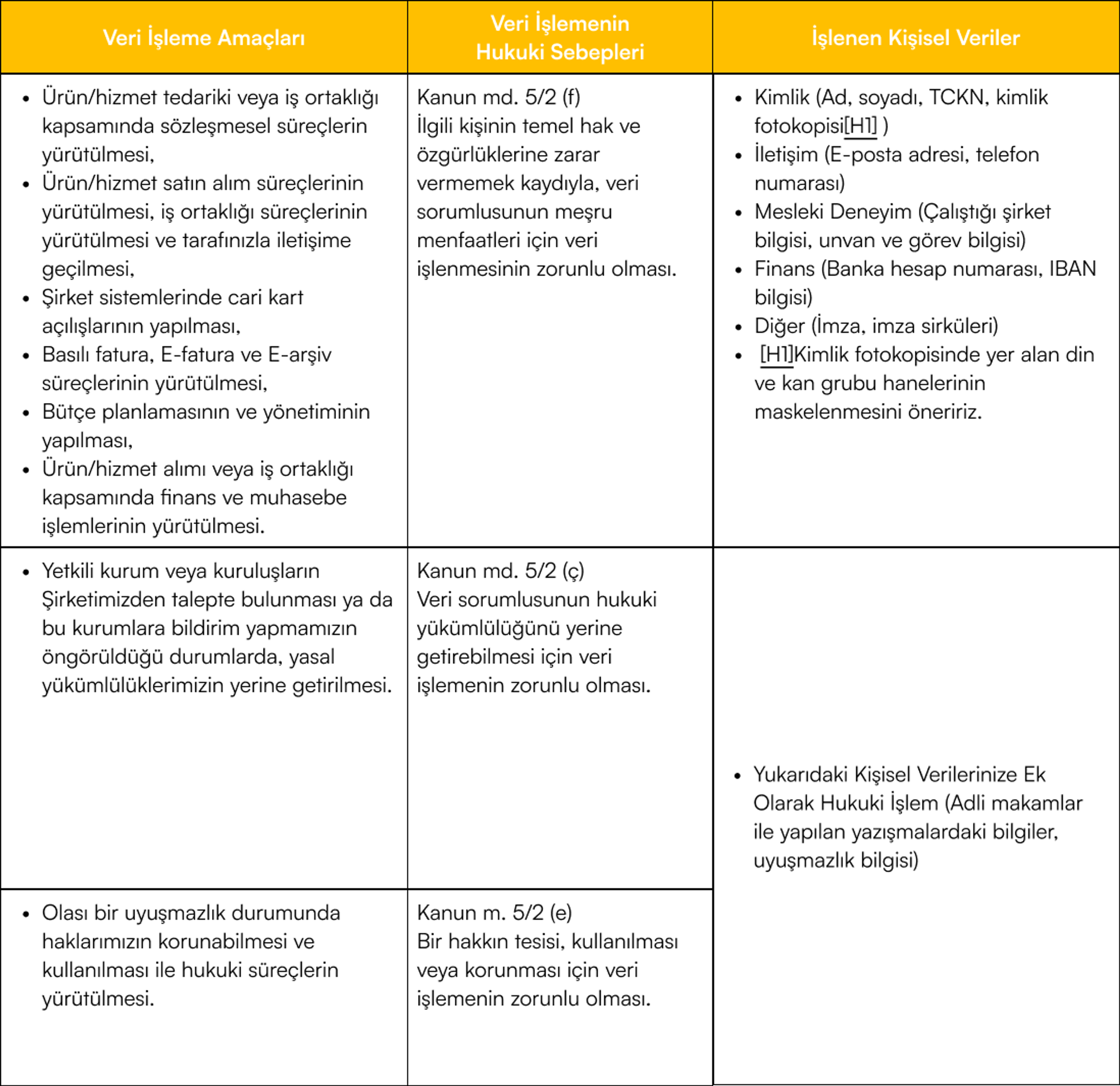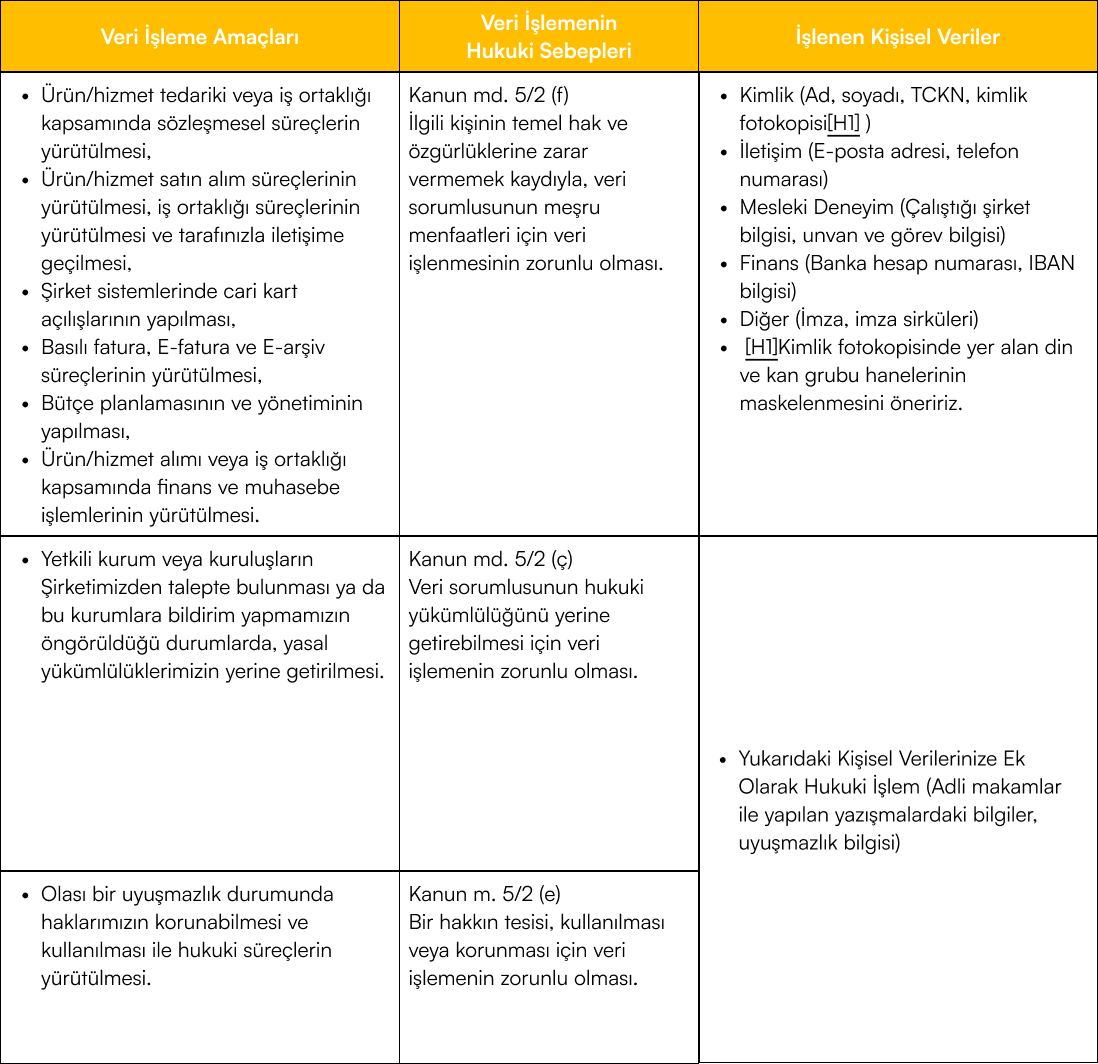 - Ürün ve Hizmet Aldığımız Şirketler ve İş Ortakları – Mal veya hizmet tedariki kapsamında tedarikçiler ve iş ortaklarından destek alınması (örneğin, bilgileriniz saklanması için bir tedarikçiden dijital altyapı desteği alınması).
