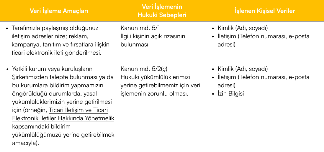 Kişisel verileriniz, tarafınıza ticari elektronik ileti gönderimleri yapılması kapsamında veri sorumlusu sıfatıyla işlenmektedir. Bu doğrultuda işlenen kişisel verilerinize ilişkin detaylı bilgi için lütfen aşağıda yer alan açıklamalarımızı dikkatlice okuyunuz.